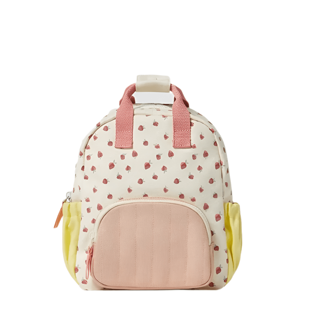 Det upprepade hallonmönstret ger väskan en söt och lekfull känsla, medan namnbrodyr på frontfickan gör den personlig – perfekt i förskolemiljö där igenkänning är viktig.
