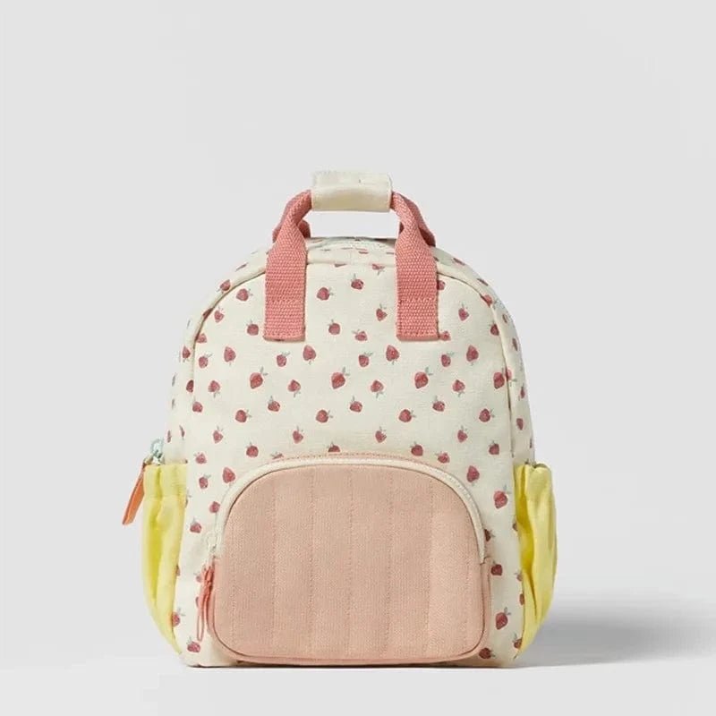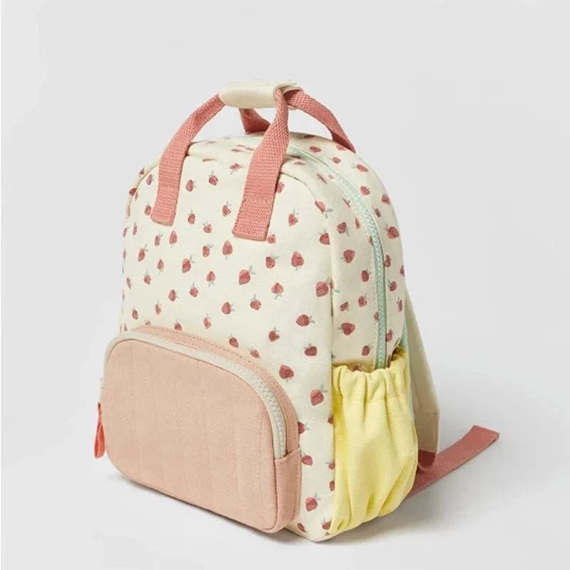 Denna barnryggsäck med hallonmotiv är både söt och praktisk – perfekt för förskolan, utflykter eller som en personlig present. Väskan har ett charmigt småmönstrat tryck med hallon, ljus basfärg, rosa dragkedjor och handtag samt gula sidofickor. Den främre fickan pryds av ett broderat namn, vilket gör väskan unik och lätt att känna igen. Den är tillverkad i tåligt tyg, har justerbara remmar och rymmer allt från snacks till leksaker. En underbar liten ryggsäck som kombinerar stil, funktion och personlighet.