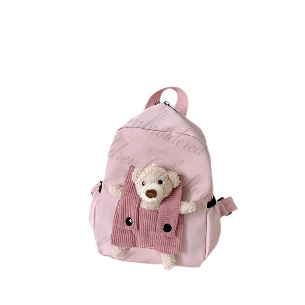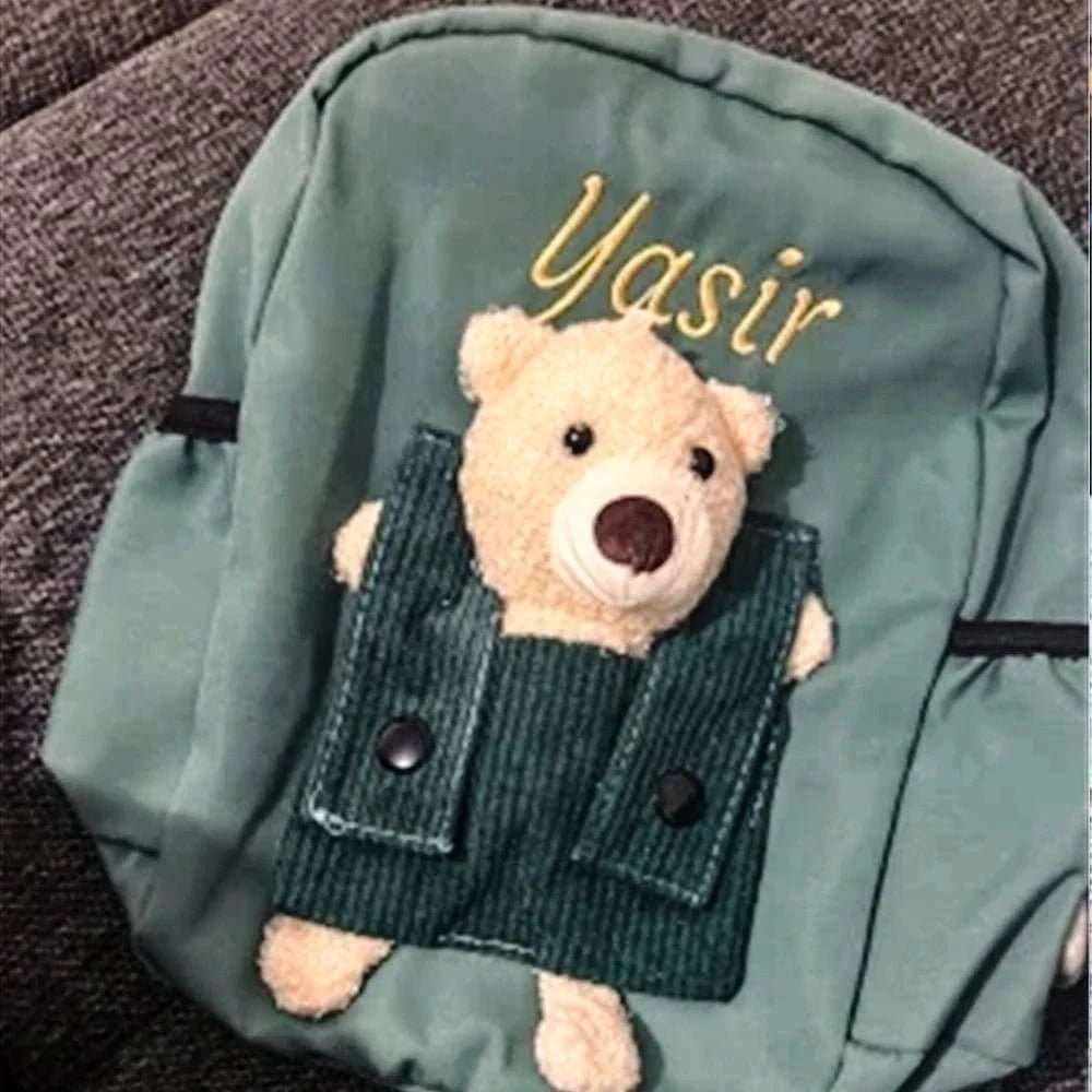 Med sitt robusta canvasmaterial och broderade namn är denna ryggsäck både tålig och unik. Den lilla nallen fäst framtill blir snabbt barnets favorit, medan flaskhållarna gör den praktisk för föräldrar. En perfekt kombination av nytta och söt stil.