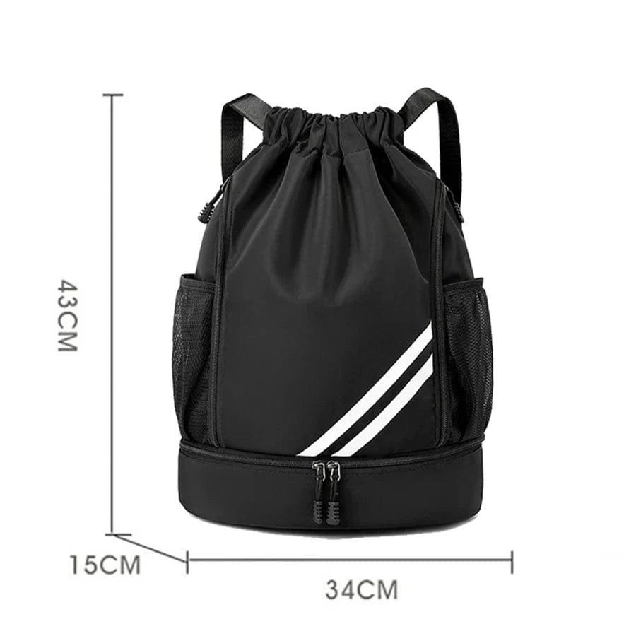 Ryggsäcken är utrustad med ett separat skofack och ventilerande sidofickor för optimal organisering av träningsutrustning. Enkel att öppna och packa.