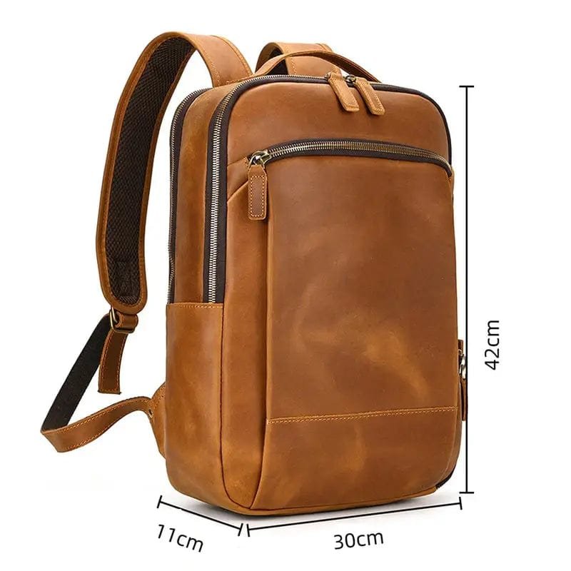 Färg: Brun Typ av artikel: Ryggsäck i äkta läder Stängningstyp: Dragkedja Material: Äkta fullkorns läder Kapacitet: 20 liter Vikt: 1200 g Mått: 42 × 30 × 11 cm Vattentäthet: Vattentät Kompatibilitet: Upp till 15,6 tum (laptop)
