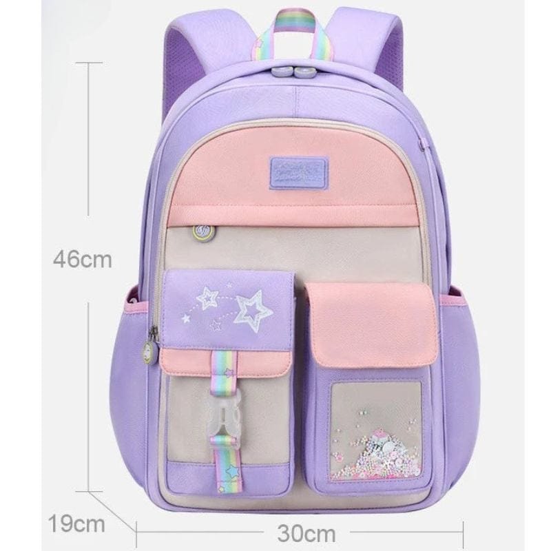 Denna mini ryggsäck för barn kombinerar funktionalitet och söt design i ett kompakt format. Med sina lekfulla färger i rosa, lila och beige samt detaljer som stjärnor och regnbågsband, blir den snabbt en favorit hos både barn och föräldrar. Den är idealisk för små utflykter, förskola eller som en första skolryggsäck. Ryggsäcken är tillverkad i slitstarkt material och har vadderade axelremmar som ger extra komfort. De praktiska framfacken gör det enkelt för barnet att hålla reda på sina småsaker. En perfekt balans mellan stil, funktion och barnvänlighet.