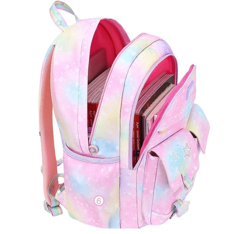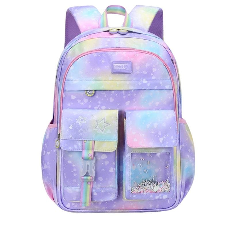 Med sitt färgglada regnbågsspänne, glittriga detaljer och stjärnmotiv, är ryggsäcken både rolig och visuellt tilltalande. Den lilla storleken är anpassad för barn i åldrarna 2–6 år och ger tillräckligt med plats för leksaker, snacks eller små skolprylar.