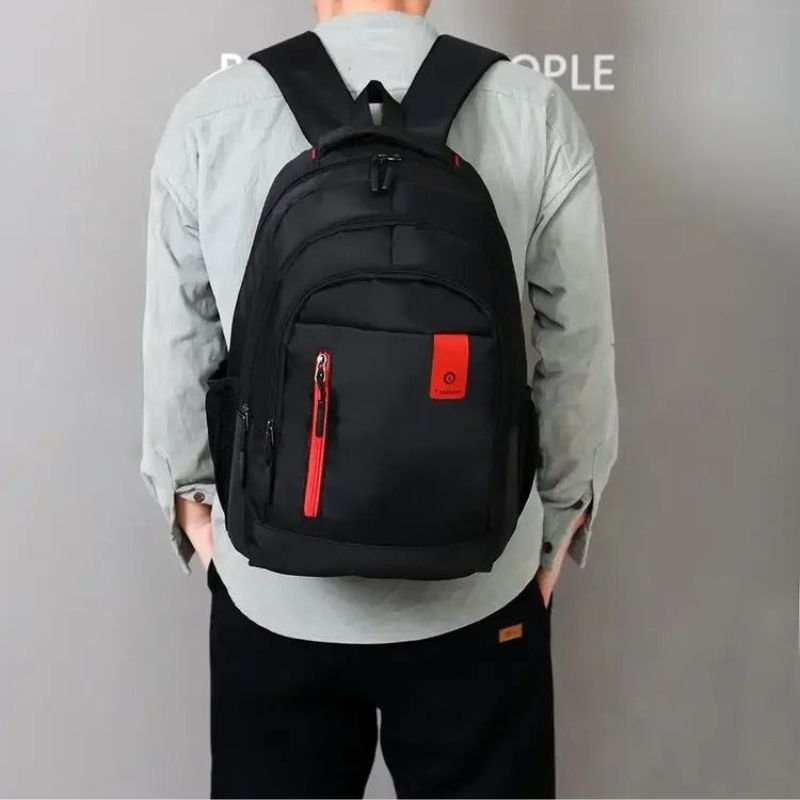 Denna multifunktionella ryggsäck kombinerar smart organisering med modern design. Med sin generösa kapacitet och flera dragkedjefack är den idealisk för skola, jobb, resa eller vardagsanvändning. Den svarta designen med röda detaljer ger ett sportigt och trendigt uttryck. Ryggsäcken har vadderade axelremmar, innerfack för laptop, samt yttre fickor för vattenflaska och tillbehör. Slitstarkt material och praktisk layout gör den till ett pålitligt val för alla tillfällen.