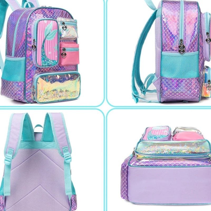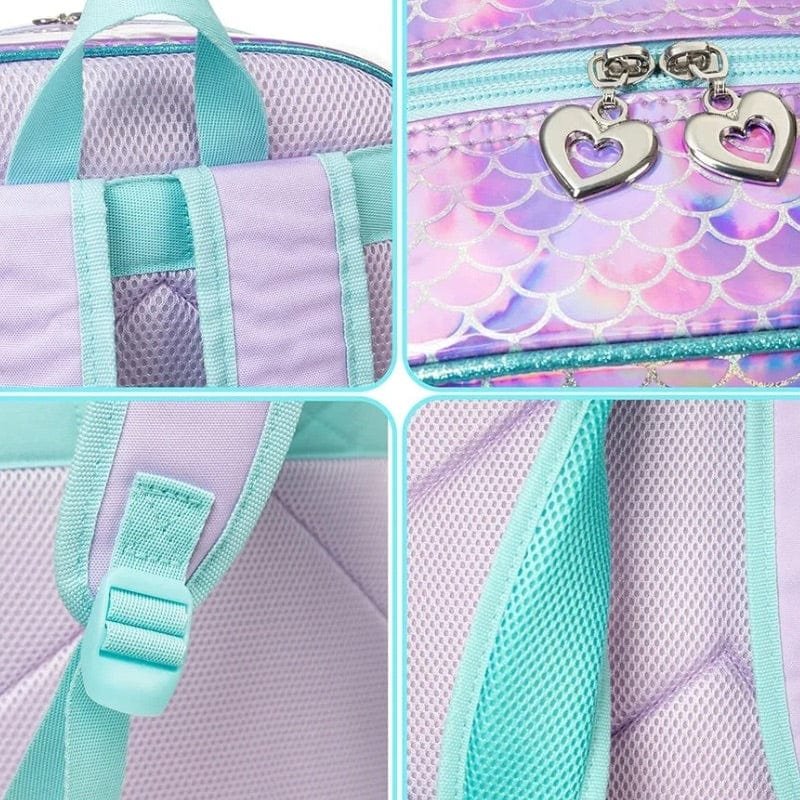 Denna sagolika ryggsäck med sjöjungfru-tema är idealisk för små barn som älskar färg och glitter. Designad med hållbart material och bekväma vadderade remmar för bästa komfort. Flera praktiska fack hjälper till att organisera böcker, leksaker och matlåda. Setet inkluderar även en matchande lunchväska och pennfodral, vilket gör den till en komplett lösning för skoldagar eller utflykter. Dragkedjor med hjärtformade detaljer ger en extra söt touch.