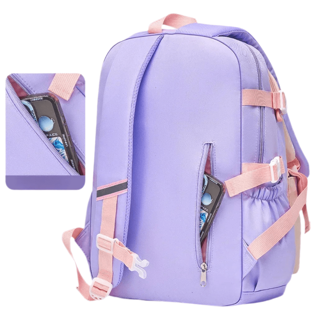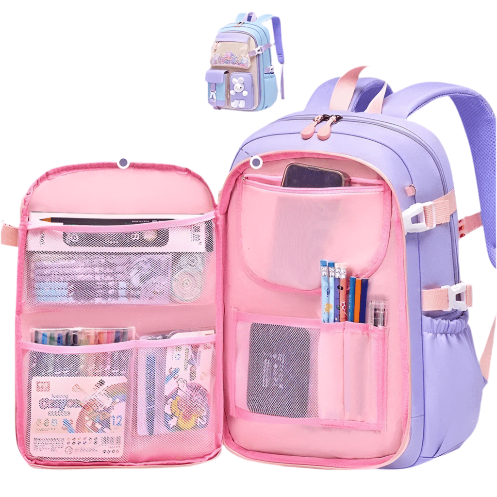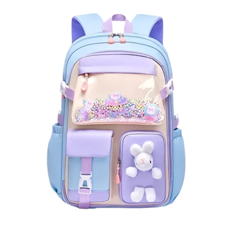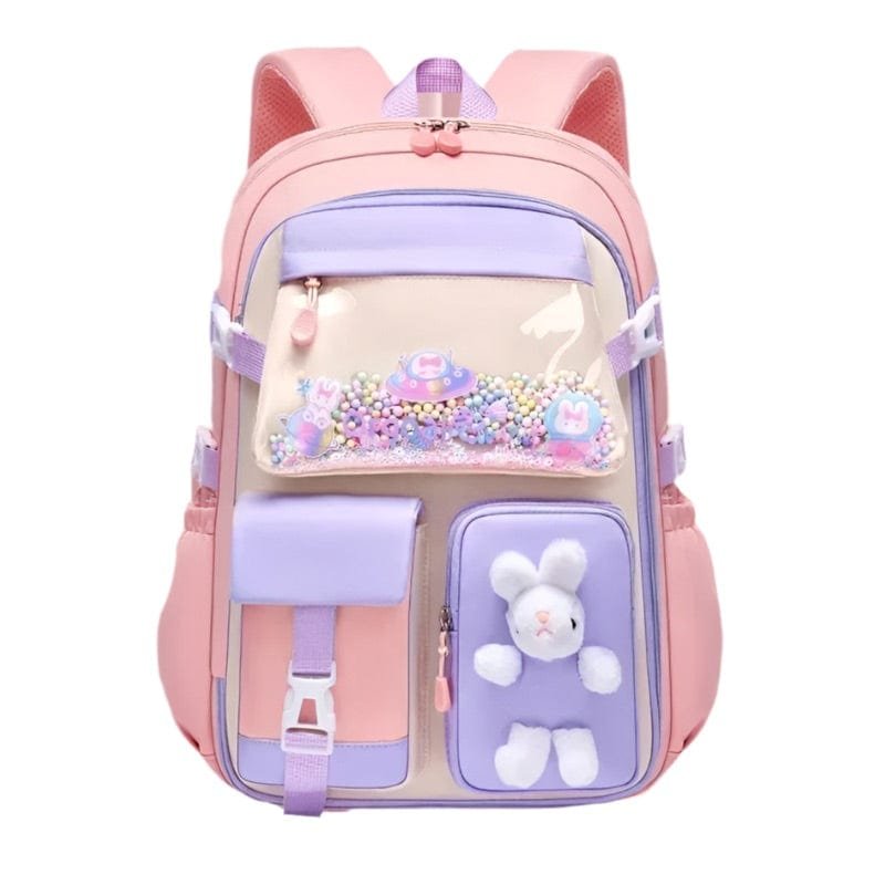 Denna lila och rosa ryggsäck är en dröm för varje flicka! Den har en transparent framficka med dekorativa pärlor, en gosig kanin-detalj, och flera smarta fack för böcker, pennor, vattenflaska och andra skolartiklar. Vadderade och justerbara axelremmar gör den bekväm att bära hela dagen. Tillverkad av slitstarkt och vattenavvisande material, vilket gör den både praktisk och stilfull.