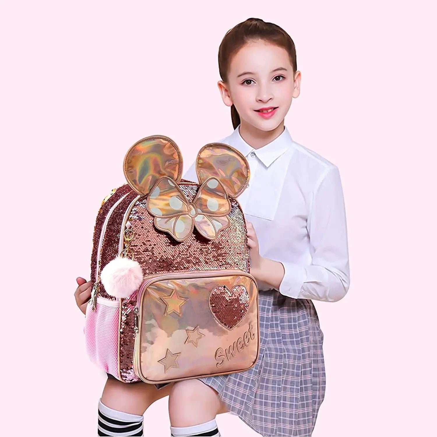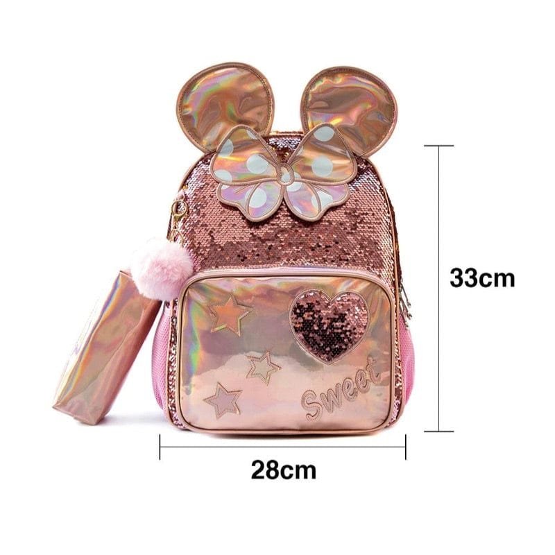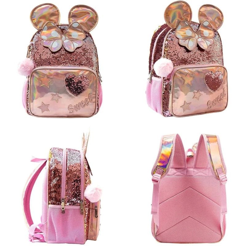 Väskan är ett riktigt blickfång, med skimrande paljetter och holografiska detaljer som gör varje skoldag lite magisk. De stora öronen och rosetten ger den en unik form, och texten ”Sweet” förstärker den charmiga känslan.