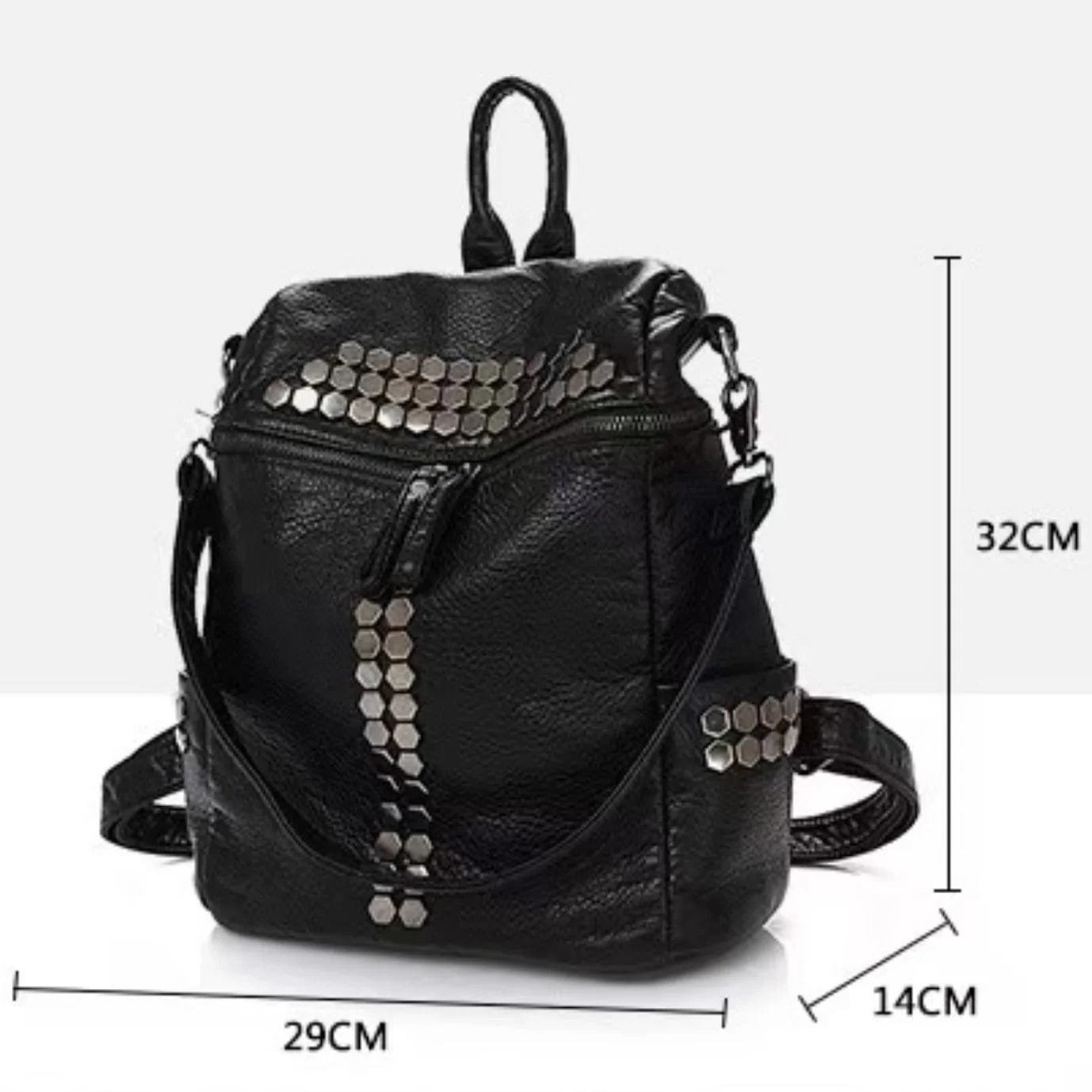 Denna svarta skinnryggsäck för damer kombinerar rockig elegans med praktisk funktionalitet. Tillverkad av högkvalitativt syntetläder, har den en stilren och slitstark design. De metalliska detaljerna ger väskan en modern touch, medan det rymliga huvudfacket och sidofickorna gör den perfekt för att förvara mobil, plånbok och andra nödvändigheter. Justerbara axelremmar och en avtagbar axelrem gör den mångsidig – bär den som ryggsäck eller axelväska. Perfekt för jobb, shopping eller resor!