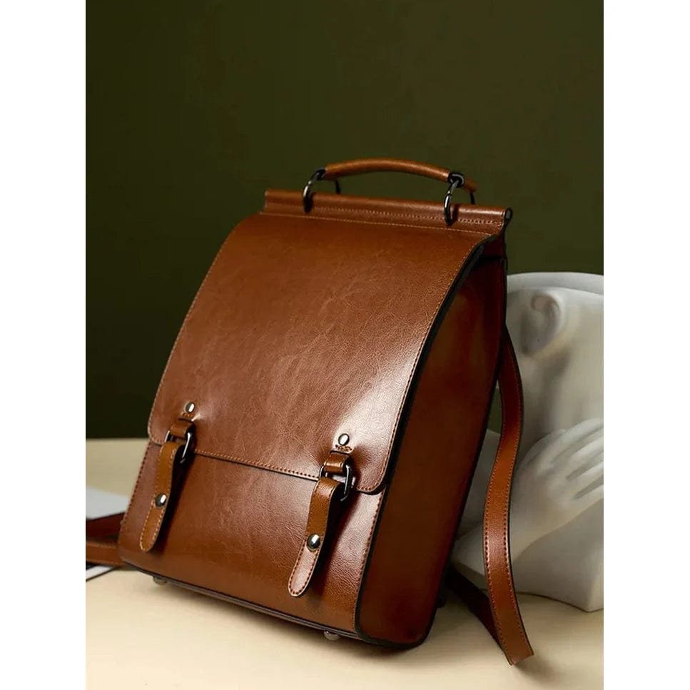 Denna ryggsäck i äkta läder är perfekt för både vardag och professionella sammanhang. Den stilrena, fyrkantiga formen med justerbara remmar gör den lätt att bära. Passar lika bra till kontoret som till en avslappnad dag på stan.
