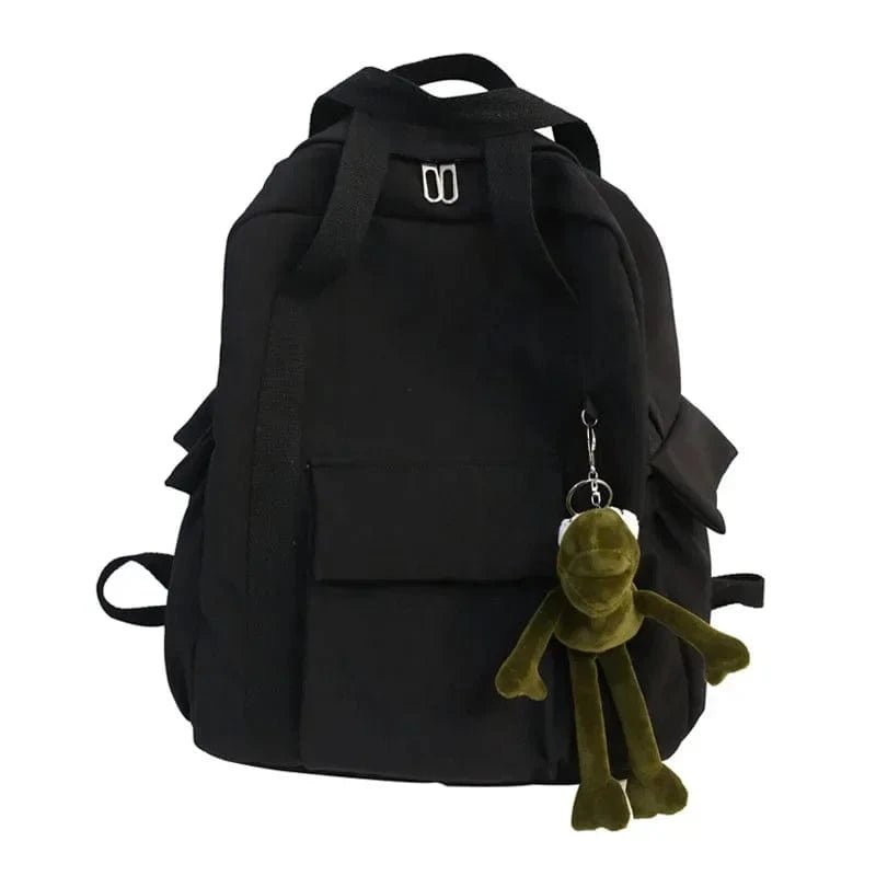 Upptäck en rymlig och trendig skolryggsäck i tyg, perfekt för kvinnor som söker både funktion och stil i vardagen. Den här olivgröna väskan är tillverkad i slitstarkt canvasmaterial som står emot dagligt slitage, och har flera fack för att organisera böcker, laptop och personliga tillhörigheter. Med både axelremmar och bärhandtag kan du bära den som ryggsäck eller handväska beroende på behov. Den lilla grodan som nyckelring ger ett lekfullt inslag – perfekt för dig som vill sticka ut utan att kompromissa med funktion.