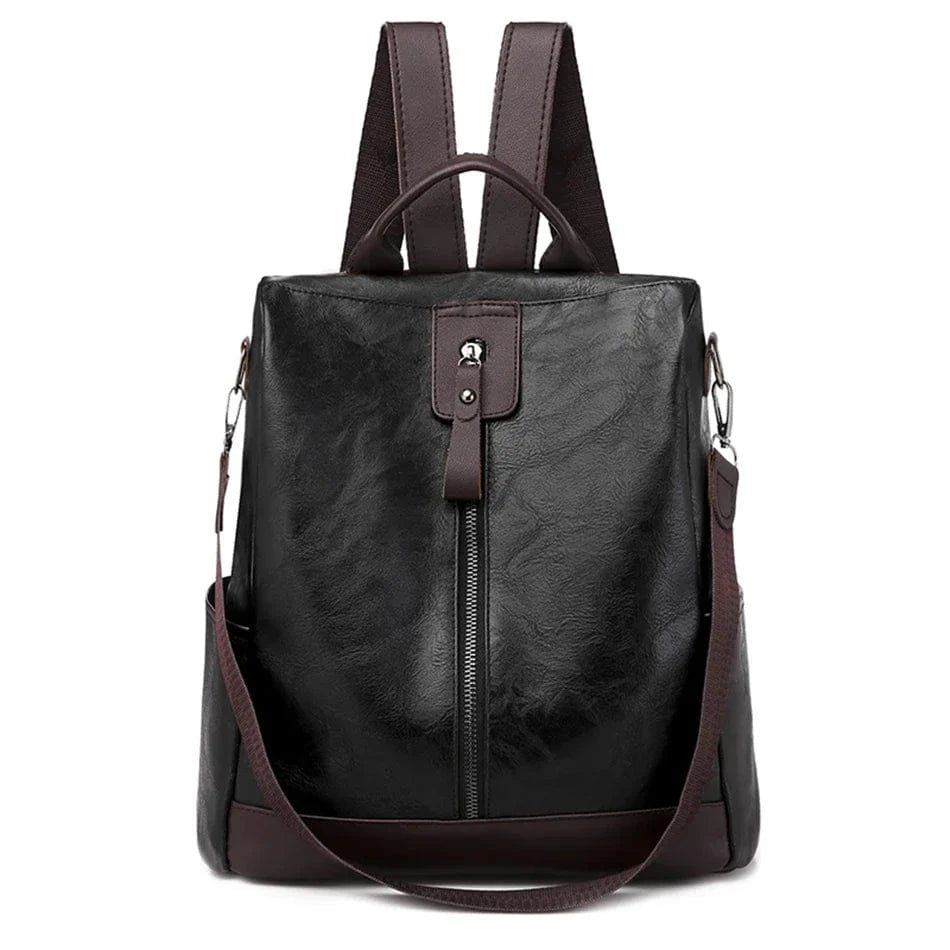 Denna snygga ryggsäck i läderlook kombinerar elegans med funktionell design. Med sin svarta yta i konstläder och kontrasterande detaljer i mörkbrunt skapas en stilfull väska som passar både till vardag och arbete. Dragkedjan framtill ger en modern touch och gör väskan enkel att öppna. Insidan är rymlig nog för dina dagliga tillhörigheter – perfekt för plånbok, anteckningsblock och till och med en liten laptop. Justerbara axelband ger flexibilitet, medan topphandtaget gör den enkel att bära som handväska vid behov.