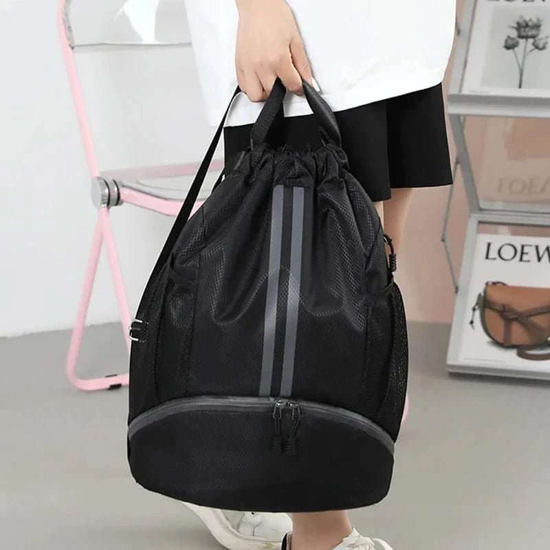 Denna sportryggsäck kombinerar lättvikt och slitstyrka, vilket gör den idealisk för sport och fritid. Ryggsäcken rymmer enkelt en basketboll, handduk och klädombyte, samtidigt som det separata skofacket ger hygienisk förvaring. De elastiska sidofickorna passar vattenflaskor, medan snöröppningen ger snabb åtkomst. Axelremmarna är justerbara för maximal komfort under hela dagen. Den sportiga looken gör att du enkelt kan bära den till gymmet, skolan eller på fritiden.
