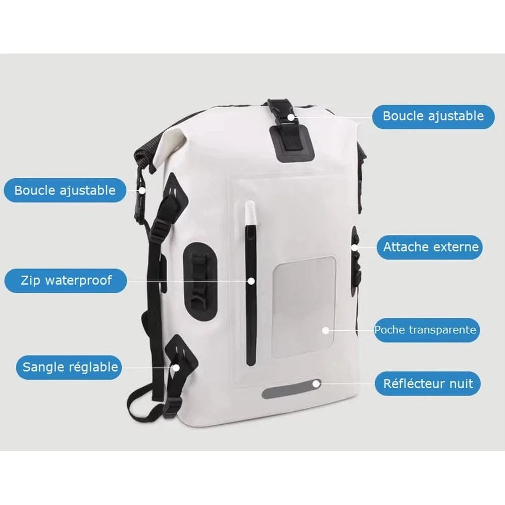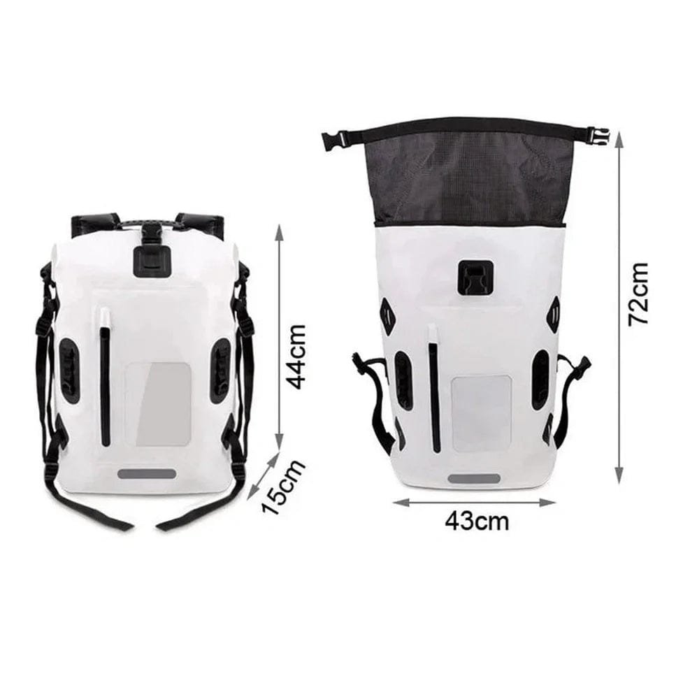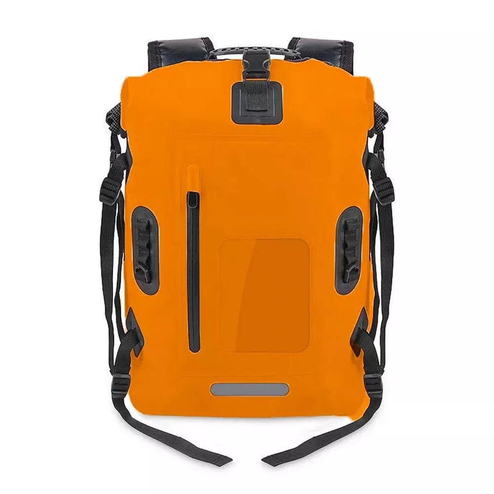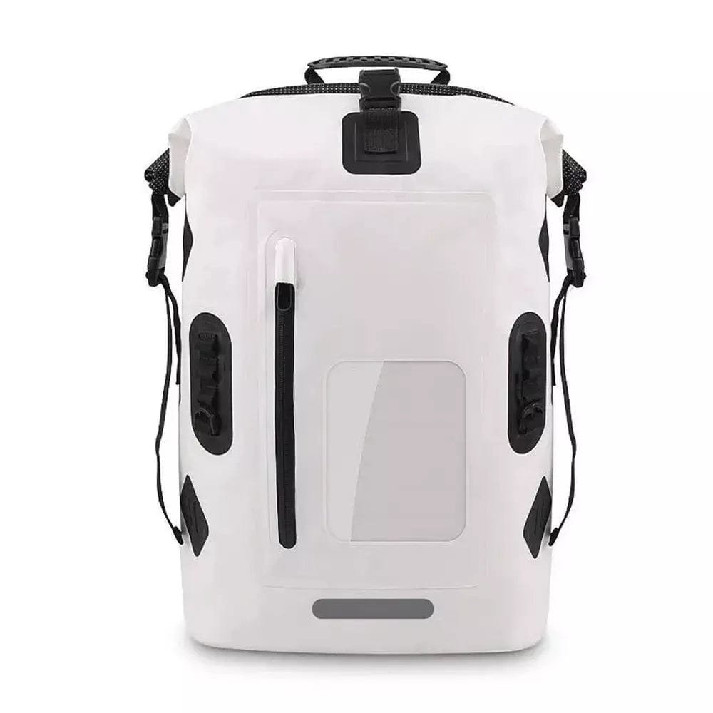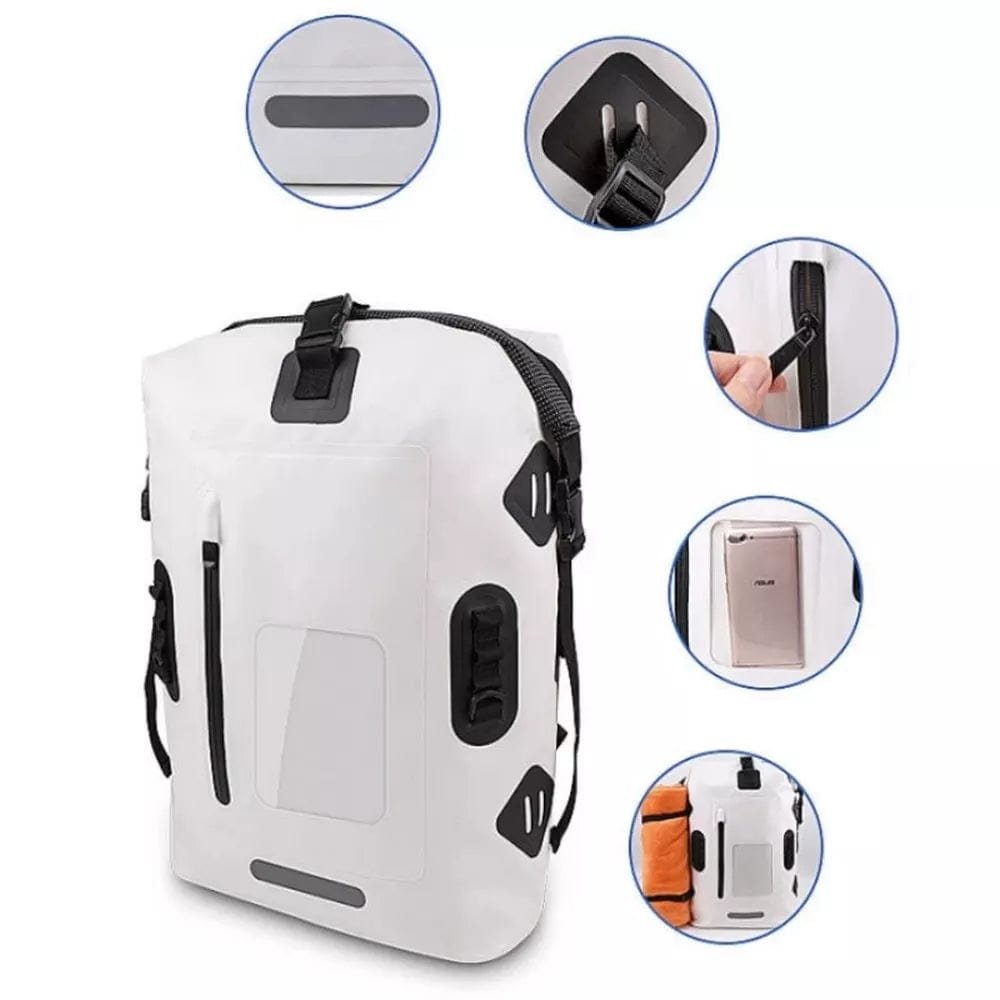 Färg: Vit, Gron, Bla, Orange, Brun, Gul, Svart Typ av artikel: Vattentät ryggsäck Stängningstyp: Roll top, clips och vattentät dragkedja Material: Förstärkt tarp 500D (polyeten och PVC) Kapacitet: 30 liter Vikt: 1250 g Mått: 43 × 44 × 15 cm Vattentäthet: 100 % vattentät