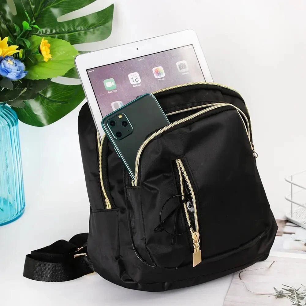 Denna svarta ryggsäck med läderinspirerad look kombinerar modern stil med praktisk funktionalitet. Perfekt för vardagen, resor eller pendling, erbjuder ryggsäcken flera fack med dragkedja för optimal organisering. Den kompakta designen rymmer både surfplatta, mobil och mindre tillbehör, samtidigt som den håller vikten låg och komforten hög. De guldfärgade detaljerna ger ett elegant intryck och skapar en tidlös accessoar som passar både till casual och mer uppklädda outfits. Justerbara remmar gör att du bär den bekvämt hela dagen.